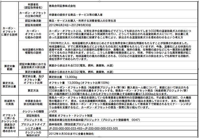 このプロジェクトでは、「とくしま絆の森」事業で取得した社有林において、オフセットクレジット(J-VER)を活用することで、整備されていない民有林を「とくしま絆の森」として購入し、公的管理を進める費用の一部を賄い、放置森林の整備を加速化させ、間伐を促進し、森林整備や林業の担い手の育成・確保など、森林・林業の再生を図り、「豊かなとくしまづくり」を図ることを目的としています。